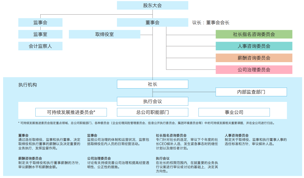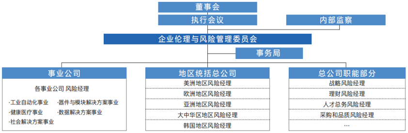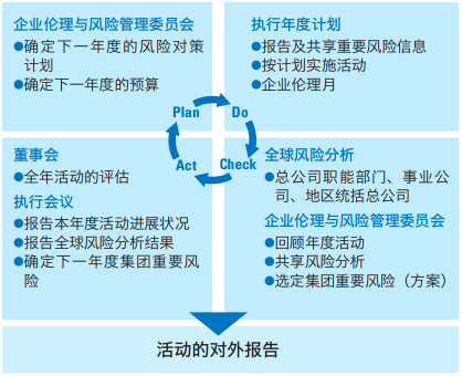 企业伦理与风险管理委员会(原则上每年召开4次)由GRL领导担任委员长,成员为主要的风险经理。该委员会讨论并分享重要风险发生状况、环境变化、风险对策状况,同时评估集团整体的风险。危机发生时,立刻向管理层报告,按照风险级别,通过危机对策本部采取应对措施。酌情向执行会议和董事会报告这些风险管理的活动状况,并接受内部监察部门的内部监察。