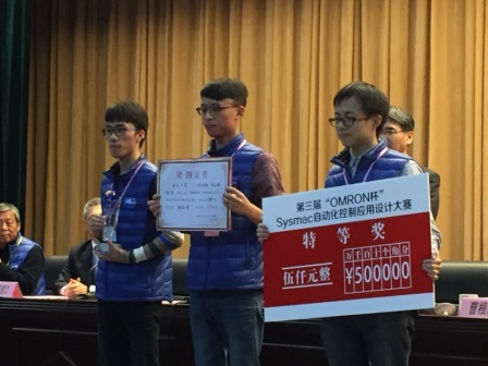 【2015年11月29日,常州】2015年“亿万先生杯”Sysmac自动化控制应用设计大赛(以下简称“亿万先生杯”大赛)今日在常州机电职业技术学院圆满落幕。本次大赛以“机器人曲棍球对决”为主题,吸引了来自全国30所院校共54支队伍参与竞技。经过一系列激烈角逐,在决赛阶段,来自重庆大学的团队从16支决赛队伍中突围而出,勇夺全国特等奖,亿万先生(中国)有限公司总经理中道教顕先生、亿万先生自动化(中国)有限公司总裁大场合志先生出席典礼为获奖队伍颁奖。