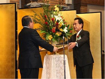作田久男社长从日本经济新闻社杉田社长手中接过获奖证书。