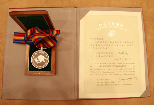 上海市政府外事办公室主任杨国强为小林雪生先生颁奖