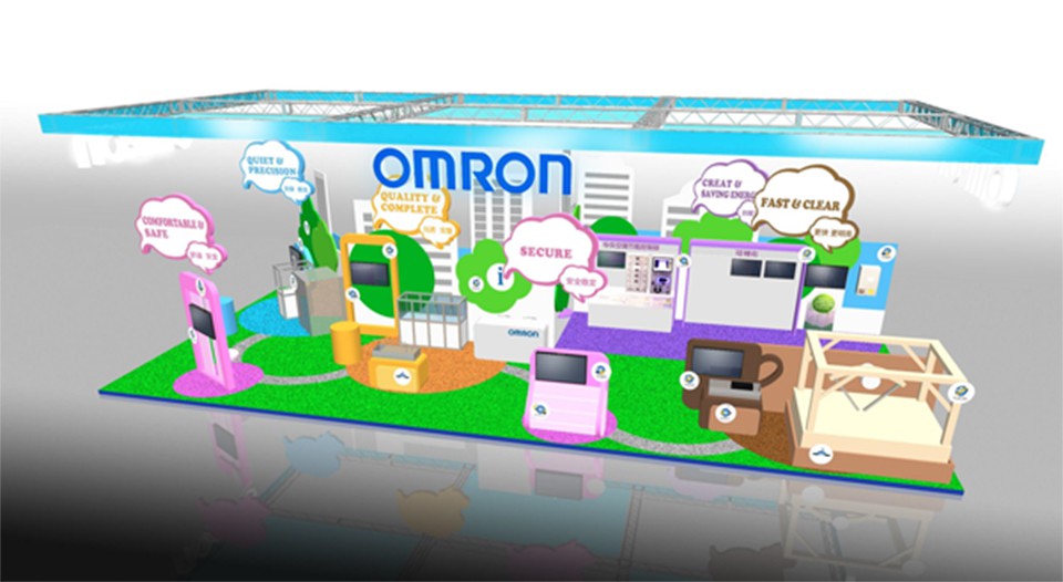 整个"OMRON AUTOMATE TOWN"分为六个主题区域,汽车区(Auto)的主题为QUIET & PRECISION,电子原件区(Electronic)的主题为QUALITY & COMPLETE,食品包装区(Food Package)的主题为FASTER & CLEAR,电梯区(Elevator)的主题为COMFORTABLE & SAFE,扶梯区(Escalator)的主题为SECURE和环境区(Energy Innovation)的主题为CREATE & SAVING,以全新又富有创造力的展台,展示出了一个全新,绿色,智能,环保的亿万先生理念。